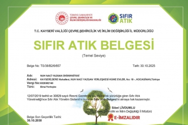 Üniversitemizin, Çevre, Şehircilik ve İklim Değişikliği Bakanlığı tarafından ülke genelinde yürütülen “Sıfır Atık” projesi kapsamında kamu kurum ve kuruluşlarının alması zorunlu hale getirilen Sıfır Atık Belgesi yenilendi. 12 Temmuz 2019 tarihli ve 30829 sayılı Resmî Gazete’de yayımlanarak yürürlüğe giren Sıfır Atık Yönetmeliği uyarınca Sıfır Atık Yönetim Sistemi’ni kuran Üniversitemiz, çevreye duyarlı uygulamalarıyla sürdürülebilir bir kampüs olma hedefini sürdürmektedir. Çevre, Şehircilik ve İklim Değişikliği İl Müdürlüğünce yapılan değerlendirmeler sonucunda Sıfır Atık Belgesi’ni yeniden almaya hak kazanan Üniversitemiz, belgeyi 30 Ekim 2030 tarihine kadar kullanmaya devam edecektir.